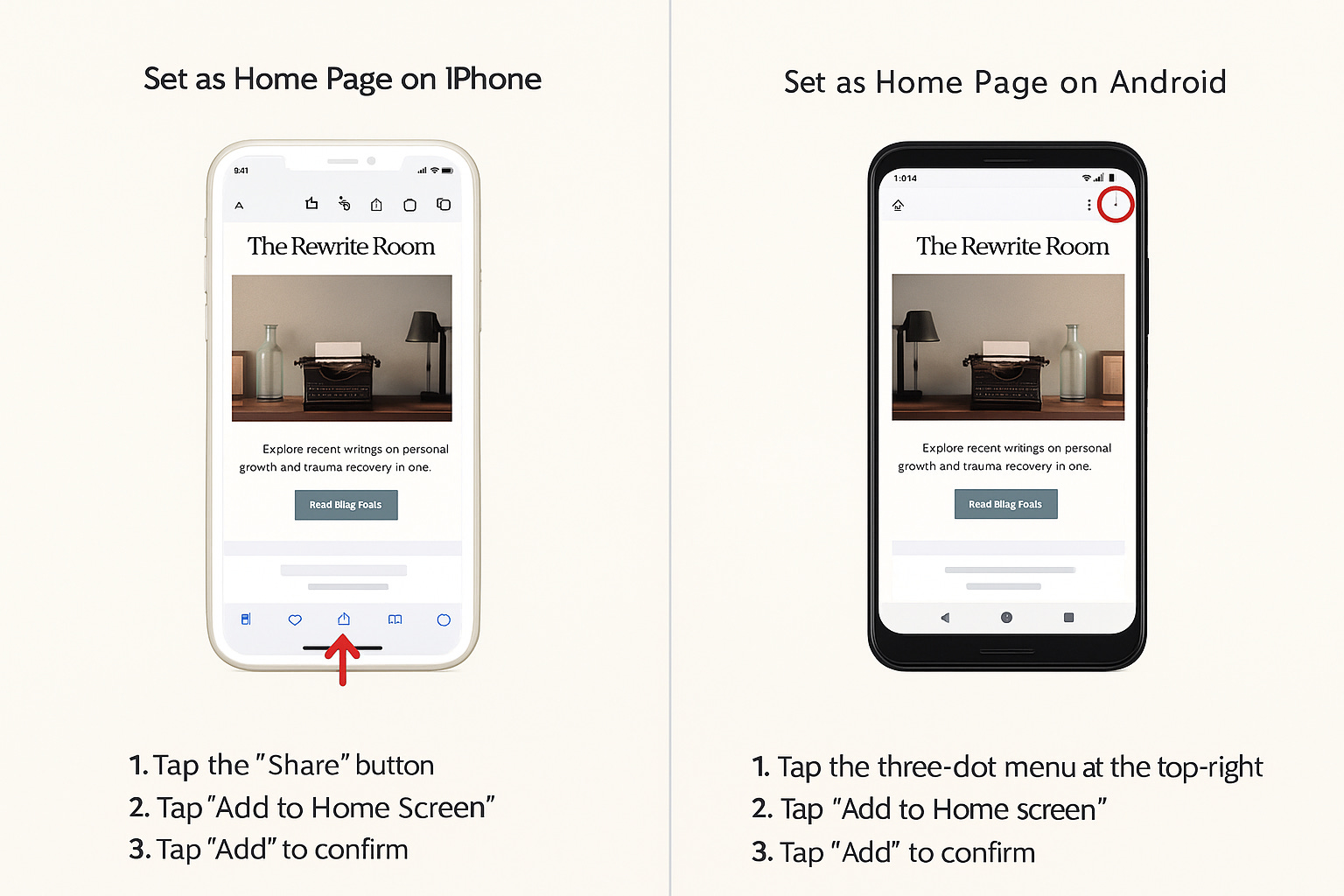 The Rewrite Room is the easiest place to find all of my recent writing in one grounded space. Every new article I publish on Substack and Medium arrives here automatically, so you always have a single doorway to return to. If you enjoy reading my work and want an easy way to reconnect without searching through apps or platforms, you are welcome to keep this page close. Many readers choose to make it their home screen so they can step into this space with one tap. Below is a simple guide on how to do that on iPhone and Android.